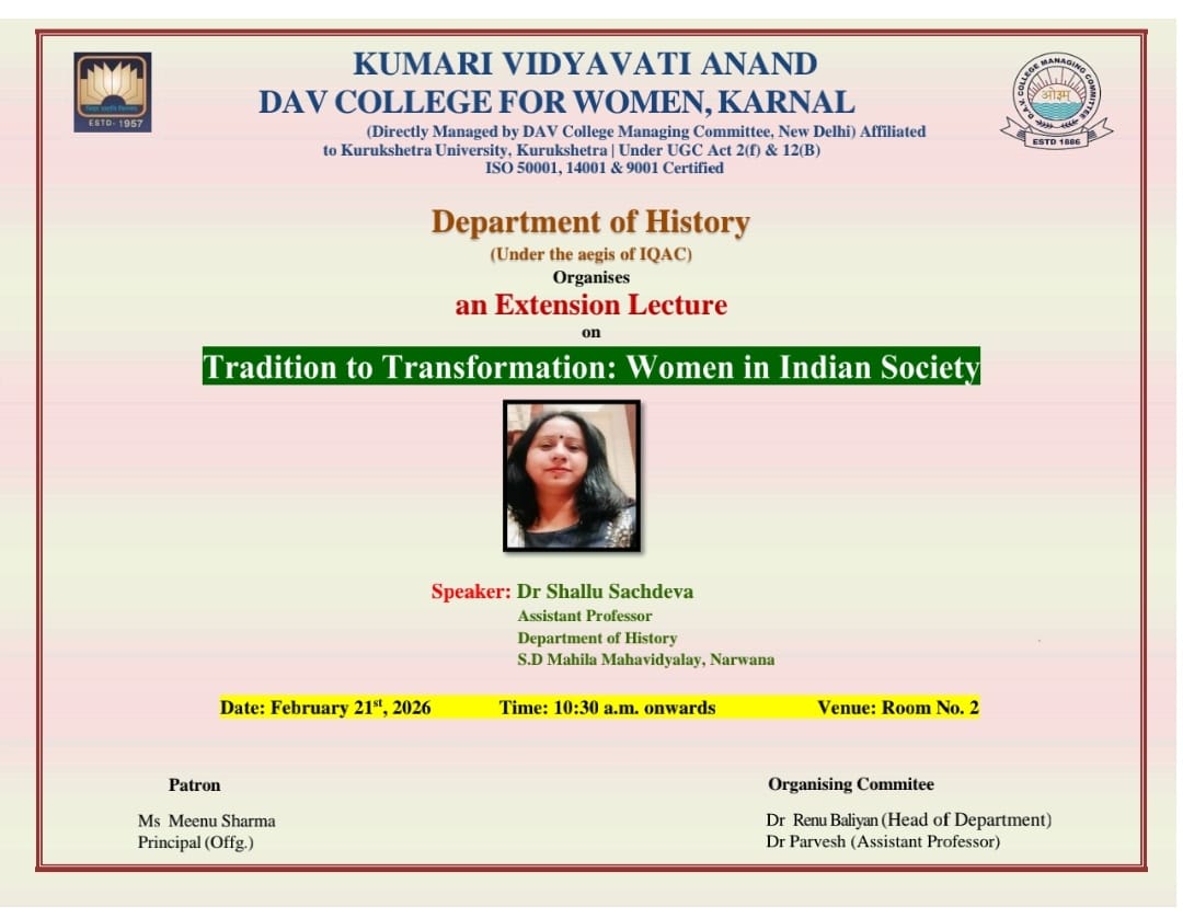 Department of History organized an extension lecture on February 21, 2026 on topic: ‘From Tradition to Change: Women in Indian Society’ . Dr Shallu Sachdeva, Assistant Professor, S.D. Mahila Mahavidyalaya Narwana was invited as a spokeperson