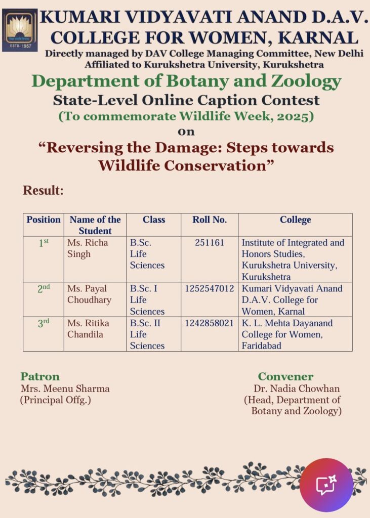 Result of State-Level Online Caption Contest organized by the Departments of Botany and Zoology to celebrate Wildlife Week (October 02-08, 2025) |