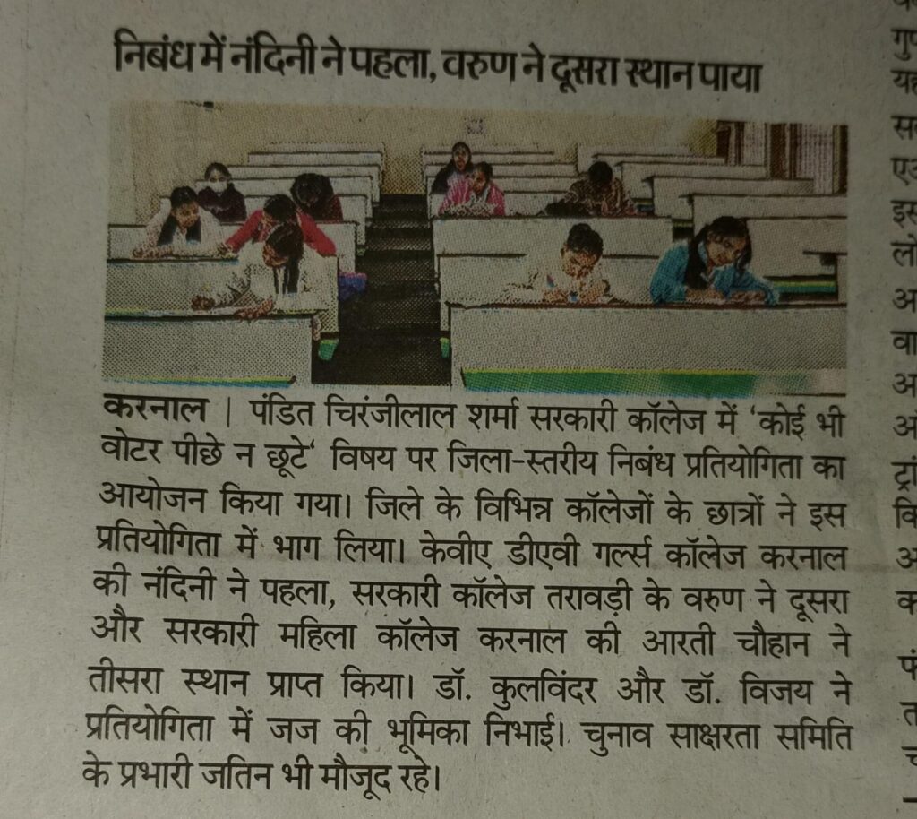 Home » Our college bagged 1st Position in District Level Essay Writing Competition on the topic “Koi bhi Voter, Peeche na Choote” organised by Pt. Chiranji Lal Sharma Govt. College, Karnal.