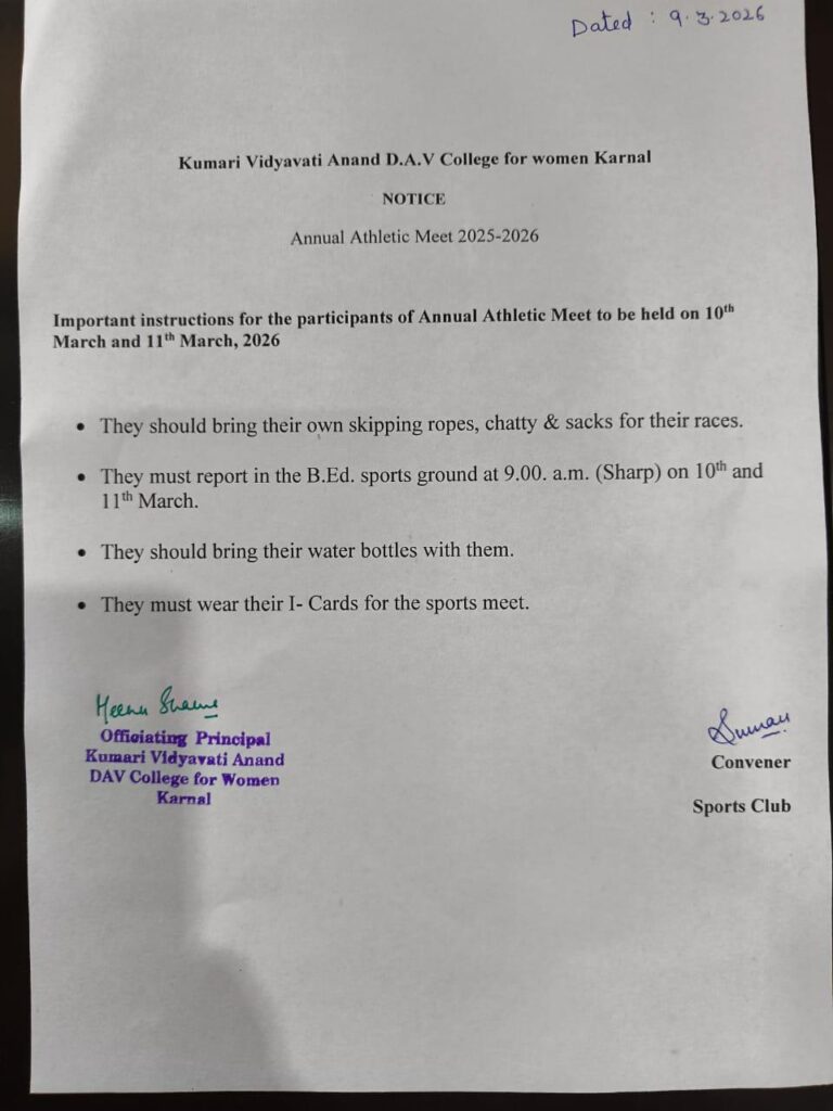 Annual Athletic Meet to be held on 10th March and 11th March, 2026