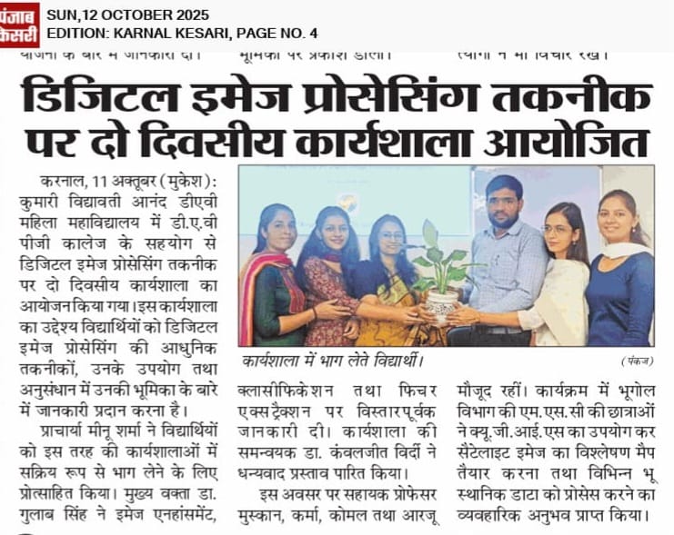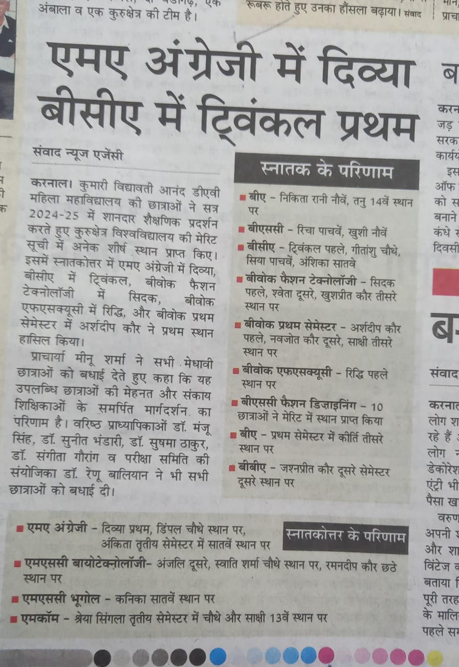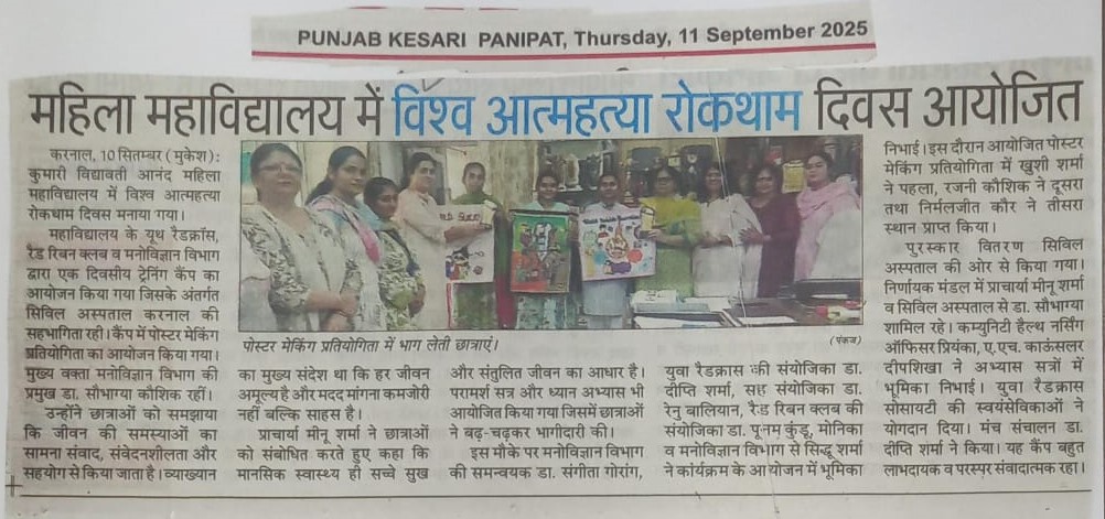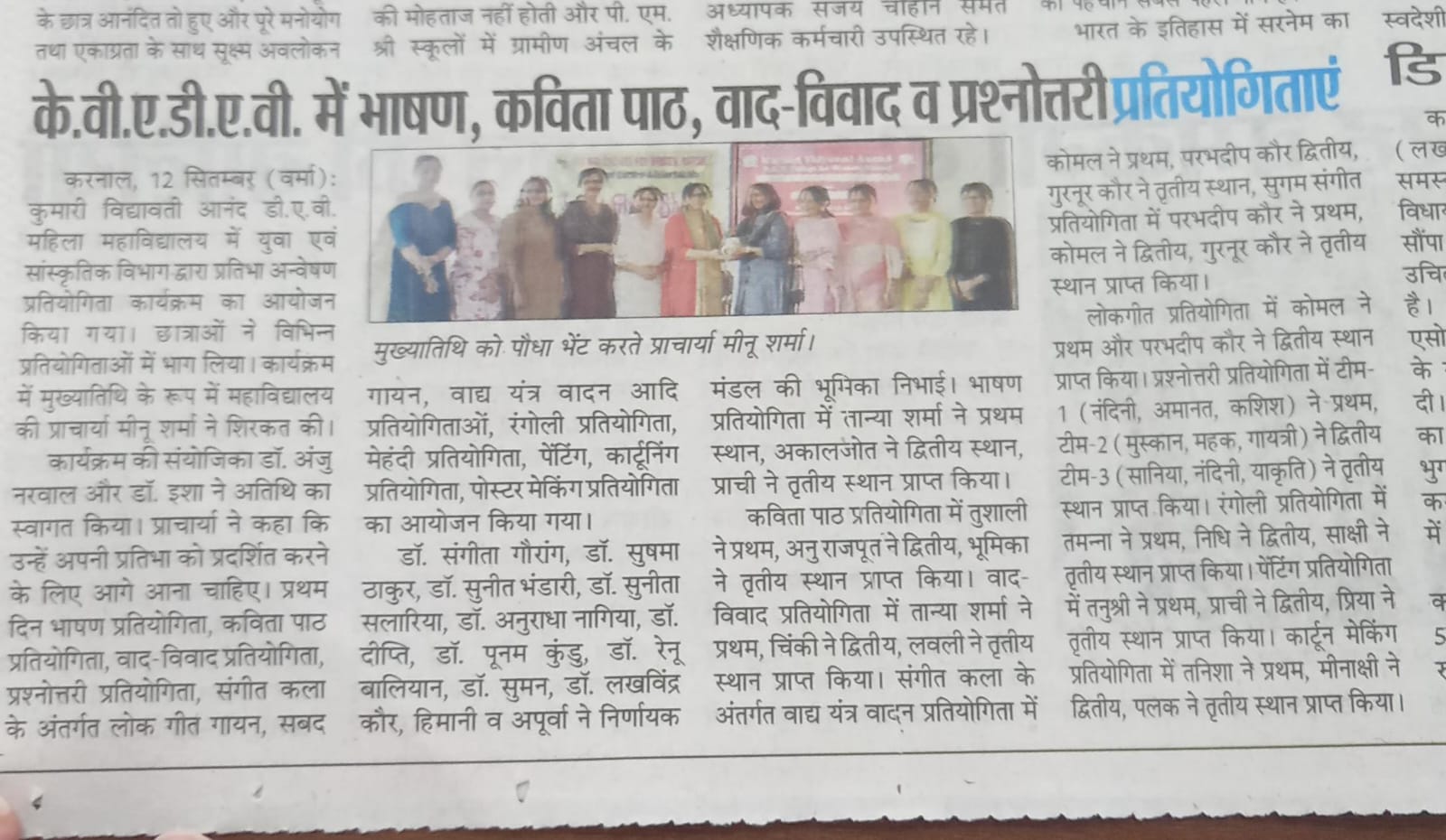 कुमारी विद्यावती आनंद डी.ए.वी. महिला महाविद्यालय करनाल के सभागार में दिनांक 21-08-2024 , महाविद्यालय के पूर्व छात्रा संघ और छात्रवृत्ति समिति के संयुक्त तत्वावधान में विस्तृत वक्तव्य का आयोजन किया गया जिसका विषय रहा-' नैतिक मूल्य और सकारात्मक दृष्टिकोण'। इस अवसर पर मुख्य वक्ता डॉ. मेजर सिंह खैरा (पूर्व प्राचार्य, गुरु नानक खालसा कॉलेज करनाल) रहे ।