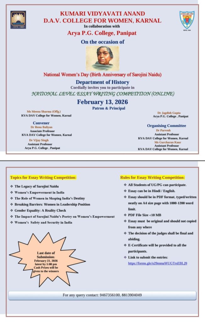 Department of History in collaboration with Arya P.G. College, Panipat organises National Level Essay Writing Competition (Online) on the occasion of National Women’s Day (Birth Anniversary of Sarojini Naidu) on February 13, 2026.